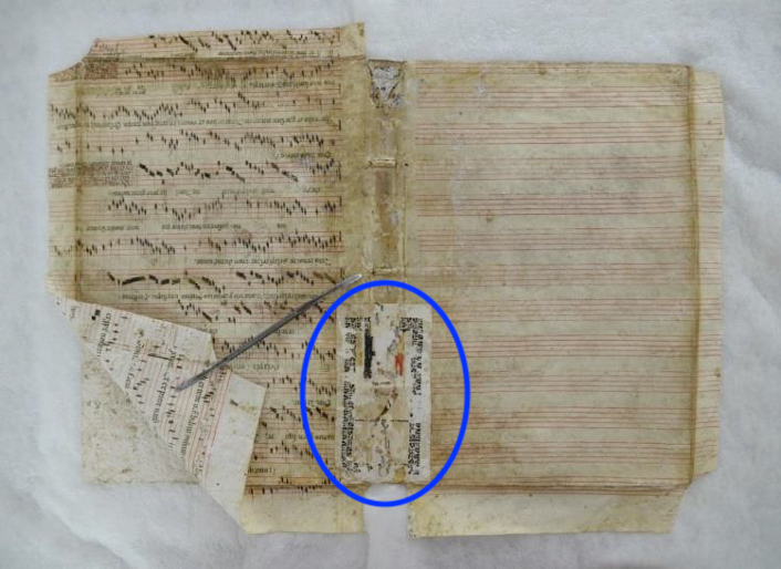 Fig. 7 - Etichetta cartacea rinvenuta sul Frammento Pv (Pavia, Biblioteca Universitaria di Pavia – MiC, Perg. Sparse, sc. 4, n° 8) durante il processo di restauro (dalla documentazione di Francesca Toscani)