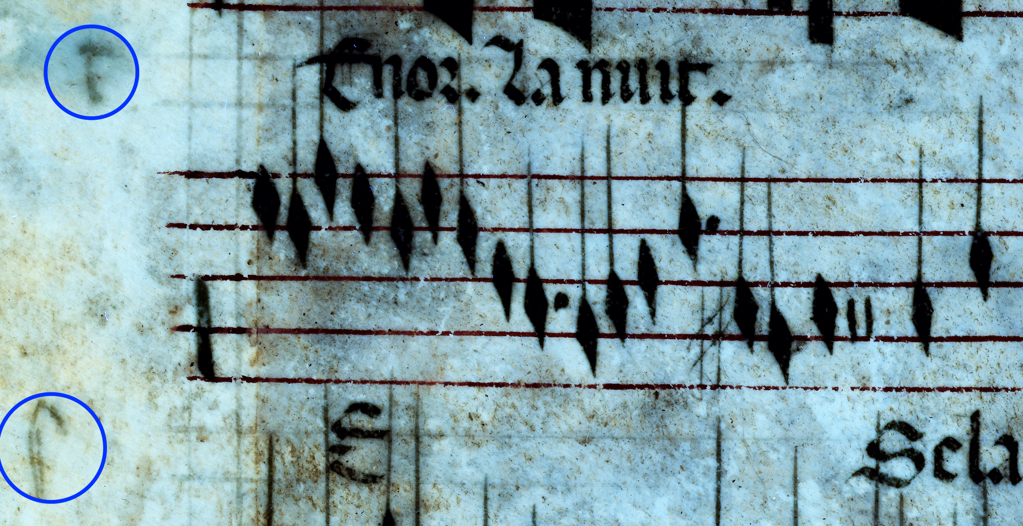 Fig. 12 - Esempi di lettrine visibili con scansione in UVIF nel margine della c. 1r del frammento Pv (Pavia, Biblioteca Universitaria di Pavia – MiC, Perg. Sparse, sc. 4, n° 8; fotografia di Marco Gargano, Dipartimento di Fisica, Università di Milano, in collaborazione con Laboratorio Arvedi – CISRiC, Università di Pavia) (fotografia di Marco Gargano, Dipartimiento di Fisica, Università di Milano, in collaborazione con Laboratorio Arvedi – CISRIC, Università di Pavia)