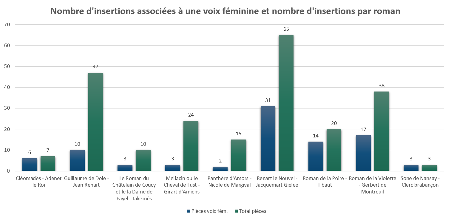 Fig. 6 : Nombre d’insertions associées à une voix féminine et nombre d’insertions par roman