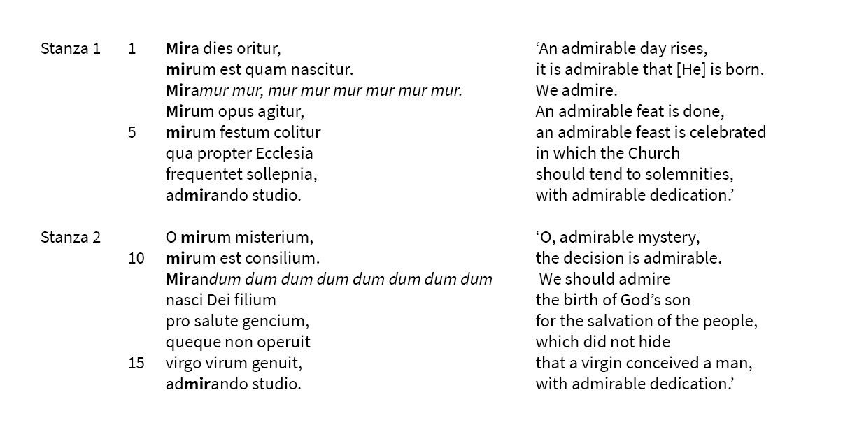 Tab. 1. Mira dies oritur (Paris, BnF, lat. 3719c, fols. 38v-39r) stanzas 1 and 2, ll. 1-16